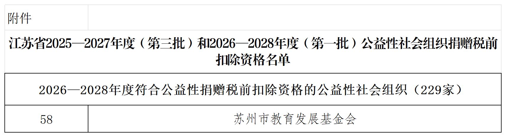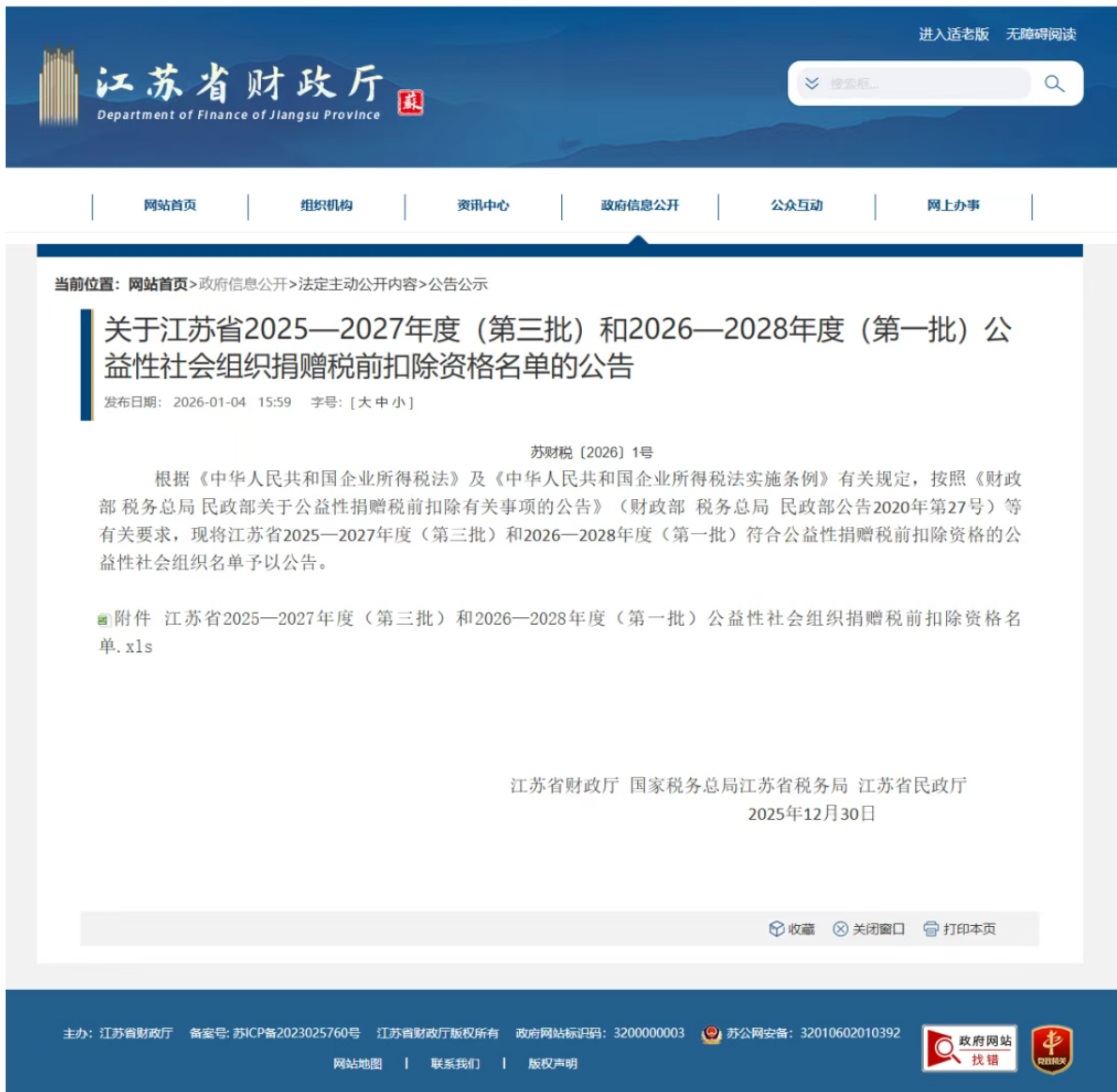 2026年1月4日,江苏省财政厅、国家税务总局江苏省税务局、省民政厅联合下发了《关于江苏省2025—2027年度(第三批)和2026—2028年度(第一批)符合公益性捐赠税前扣除资格的公益性社会组织名单的公告》(苏财税〔2026〕1号)。